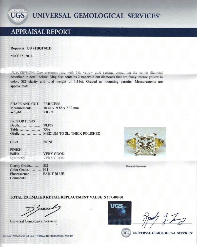 18KW PRINCESS-CUT DIA RING; 7.03 DIA PR I SI2 (EGLUSA) US911031701D;