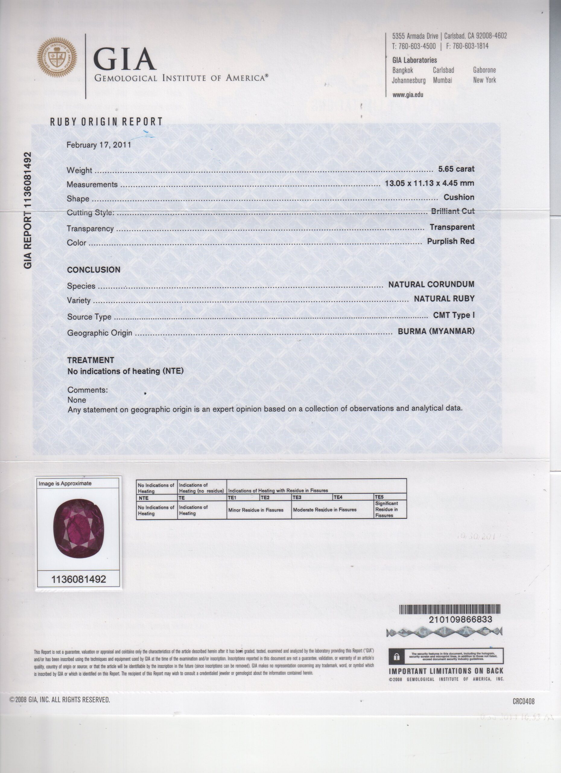 18KW BURMA RUBY DIA RING; 5.65 RUB CU BURMA (GIA) 1136081492; NO HEAT